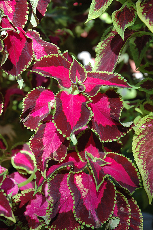 Chocolate Covered Cherry Coleus' attractive serrated pointy leaves remain cherry red in color with distinctive light green edges and tinges of crimson throughout the year on a plant with an upright spreading habit of growth.