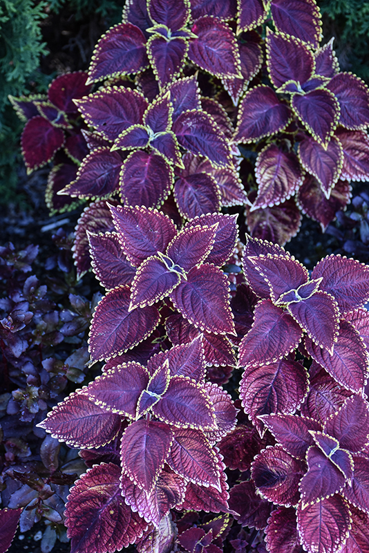 Fireball Coleus' attractive serrated pointy leaves remain crimson in color with distinctive light green edges throughout the year on a plant with an upright spreading habit of growth.