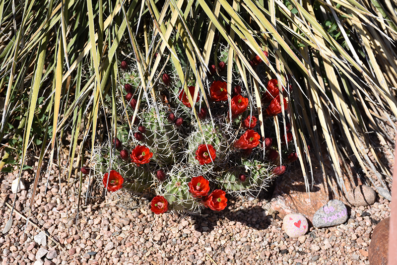 Mexican Claret Cup is a member of the cactus family, which are grown primarily for their characteristic shapes, their interesting features and textures, and their high tolerance for hot, dry growing environments. Like all cacti, it doesn't actually have leaves, but rather modified succulent stems that comprise the bulk of the plant, and which are designed to hold water for long periods of time. This particular cactus is valued for its rigidly upright and cylindrical habit of growth, and usually grows as a single spiny ribbed grayish green stem. This plant features solitary red cup-shaped flowers with orange overtones and creamy white eyes along the stems in late spring.