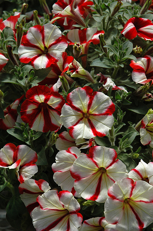 Crazytunia® Cherry Cheesecake Petunia is bathed in stunning white trumpet-shaped flowers with cherry red stripes at the ends of the stems from mid spring to late summer. Its pointy leaves remain green in color throughout the season.