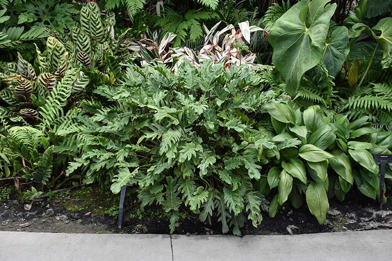 A dense, low spreading tropical plant with deeply dissected, lobed green leaves that are glossy; foliage arches downward from long upright petioles; flowers rarely; great for medium height groundcover, containers or as a houseplant