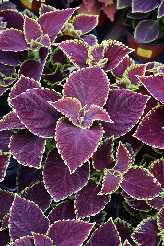 Premium Sun Chocolate Mint Coleus' attractive serrated pointy leaves remain burgundy in color with distinctive light green edges throughout the year on a plant with a mounded habit of growth.