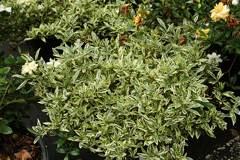 Variegated Radicans Gardenia features showy fragrant double white flowers at the ends of the branches from late spring to early summer. The flowers are excellent for cutting. It has dark green foliage edged in creamy white. The glossy pointy leaves remain dark green throughout the winter.