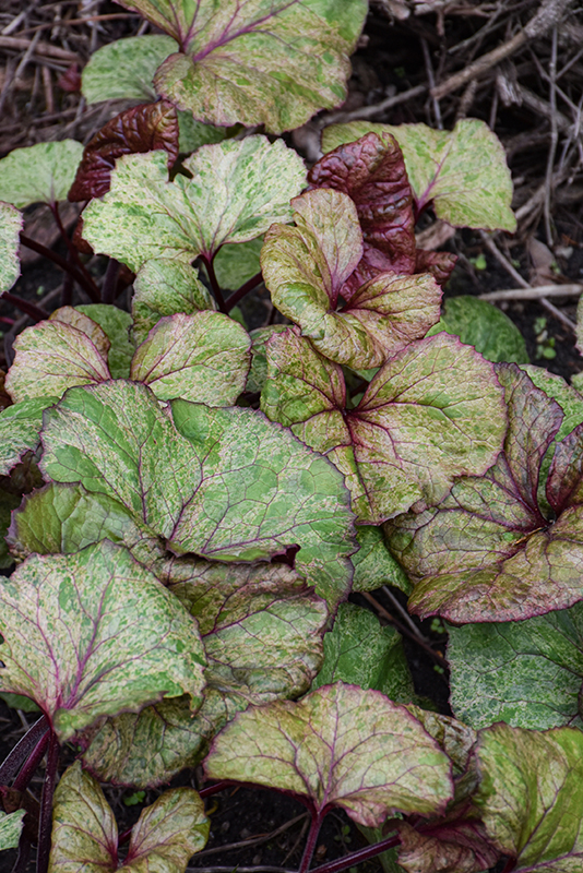 An interesting and colorful variety featuring large, cream colored leaves splashed with lime, darker green and pink, and magenta colored veins and leaf backs; yellow daisy-like flowers in early summer; a great color and texture addition to the garden
