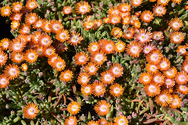 A low growing carpet-like, succulent, native to South Africa but amazingly hardy in North America; dazzling orange daisy-like flowers with pale, shell pink centers and yellow eyes; perfect for xeriscapes, rock gardens, screes and sandy soils