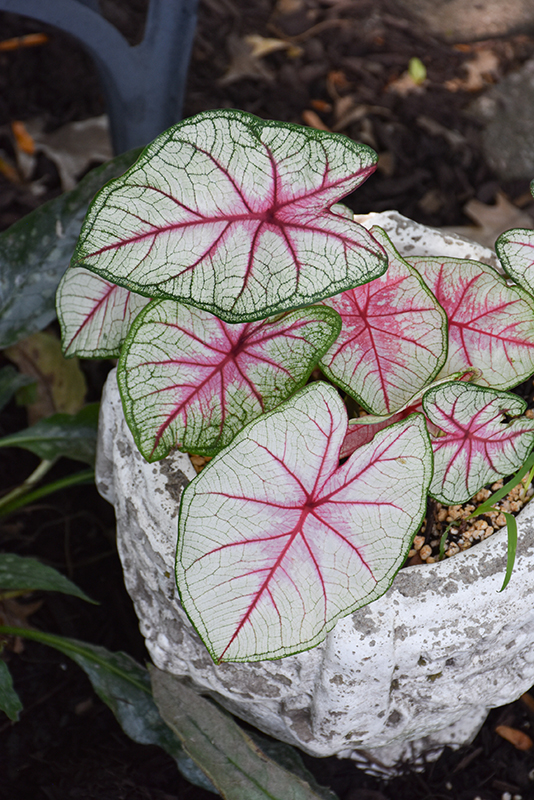 Summer Breeze Caladium's attractive heart-shaped leaves remain white in color with distinctive cherry red veins and tinges of dark green throughout the season on a plant with a mounded habit of growth.
