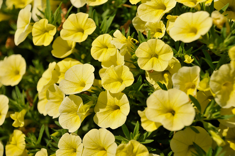 Cabaret® Lemon Yellow Calibrachoa is bathed in stunning lemon yellow trumpet-shaped flowers at the ends of the stems from late spring to early fall. Its small pointy leaves remain green in color throughout the season.