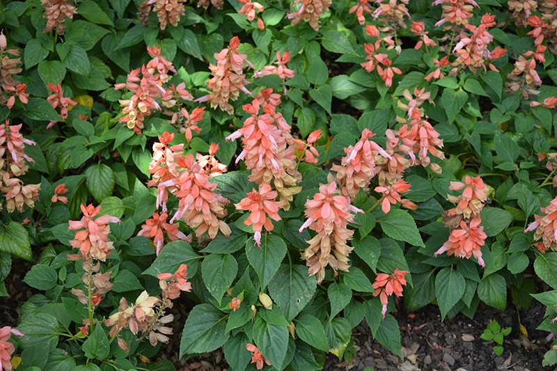 Vista™ Salmon Sage has masses of beautiful spikes of salmon tubular flowers with orange calyces rising above the foliage from late spring to early fall, which are most effective when planted in groupings. The flowers are excellent for cutting. Its attractive serrated heart-shaped leaves remain dark green in color throughout the season.