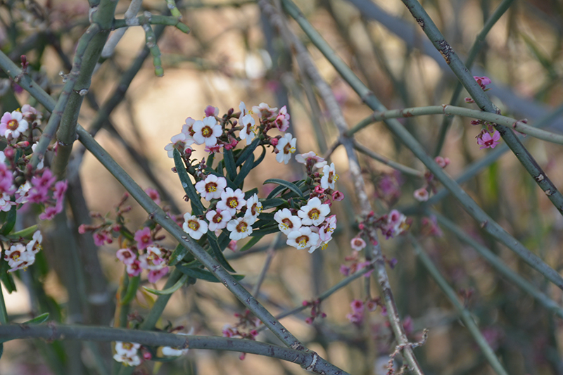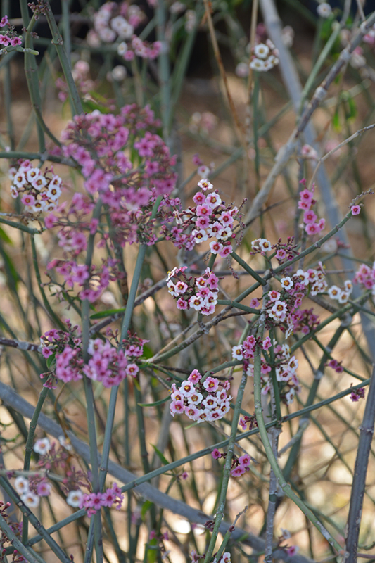 A fast growing, openly branched shrub with thin gray-green stems bearing small leaves that appear just after the flowers, then often drop off in the high temperatures of summer; fragrant, pink flushed white flower clusters appear mid-winter