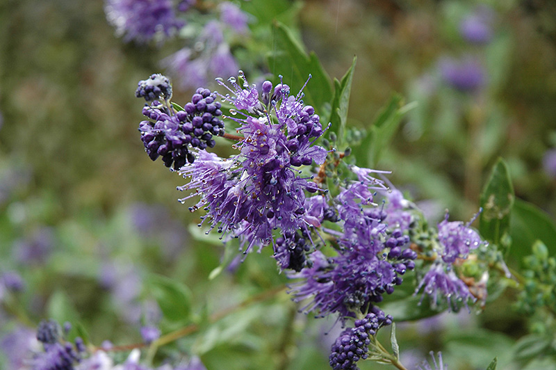 Blue Mist Caryopteris features dainty cymes of powder blue flowers along the branches from late summer to early fall. The flowers are excellent for cutting. It has grayish green foliage with silver undersides. The fuzzy oval leaves do not develop any appreciable fall color.